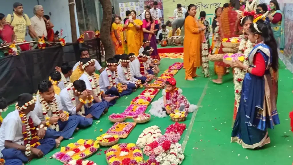 ফুলের স্পর্শে রঙের আনন্দ, দৃষ্টিহীন শিশুদের সঙ্গে ‘শারদীয়া’র ফুলদোল উদ্যাপন