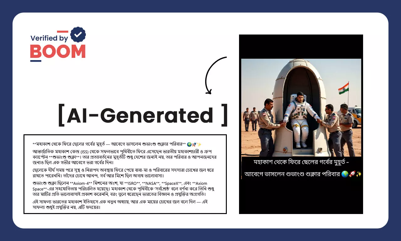 বুম দেখে ছবিতে শুভাংশু শুক্লর পৃথিবীতে অবতরণের আসল দৃশ্য দেখা যায় না, এটি কৃত্রিম বুদ্ধিমত্তা দিয়ে তৈরি।